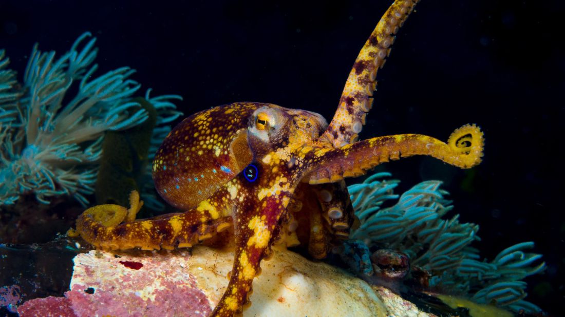 Octopuses have thousands of specialised cells (chromatophores) under their skin that allow them to change colour instantaneously. They can change not only their colouring but also the texture of their skin to match rocks, corals, sand or plants – a clever tactic that can help them hide in plain sight and surprise prey. According to a study published in the journal Current Biology, octopuses may also darken their colour and increase their size by standing taller to signal aggression towards another animal, different species or not, to stand their ground, or even to initiate a fight.3Scheel D, Godfrey-Smith P and Lawrence M. 2016. Signal Use by Octopuses in Agonistic Interactions. Current Biology. 26 (3) 377-382.
