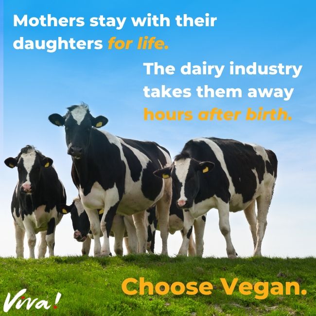 Suggested caption: Mothers and their female offspring naturally stay in the same herd for life. The dairy industry takes babies away a few hours after birth just so humans can have her milk. This is traumatic for both the mother and the baby, who will never see each other again. Choose vegan.