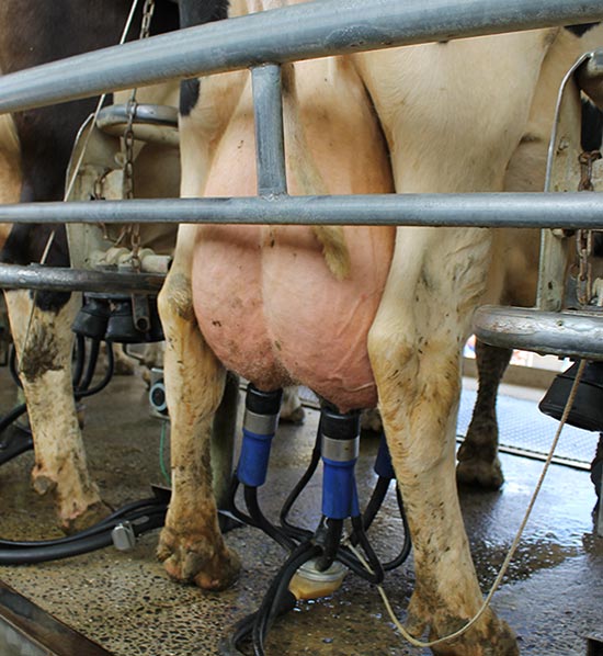 A calf would normally feed five to six times a day and the maximum amount of milk in the cow’s udder at any one time to meet this demand would be around two litres. But on most dairy farms, a cow is milked only twice a day, meaning that up to 20 litres of milk can accumulate in her udder. This greatly enlarges it, causes pain, leads to lameness in her hind legs and predisposes her to mastitis (a painful infection of the udder).
