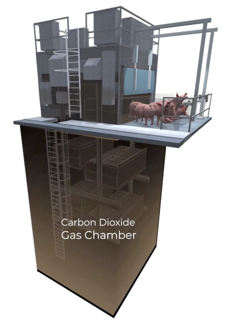See Direct Action Everywhere’s 3D reconstruction of a Marel stunning chamber below.4Greenburg A. 2023. Spy cams reveal the grim reality of slaughterhouse gas chambers. Wired 18 January. Available at https://www.wired.com/story/dex-pig-slaughterhouse-gas-chambers-videos/ [Accessed 18 November 2025].