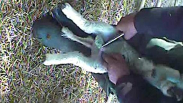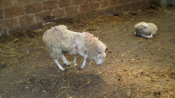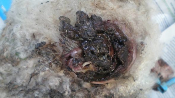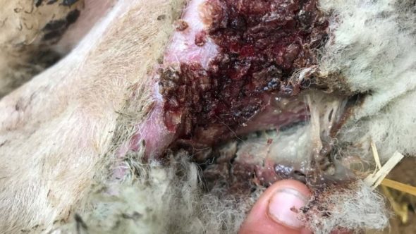 A sheep’s wounds after shearing.