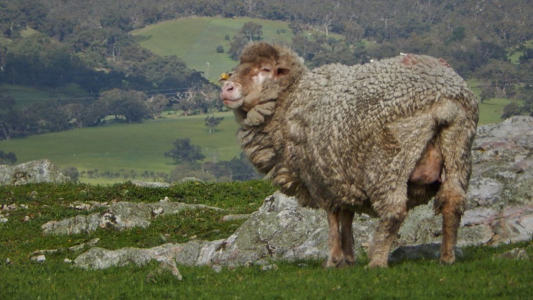 A mulesed Merino sheep in Australia. Photo by Michael Coghlan.