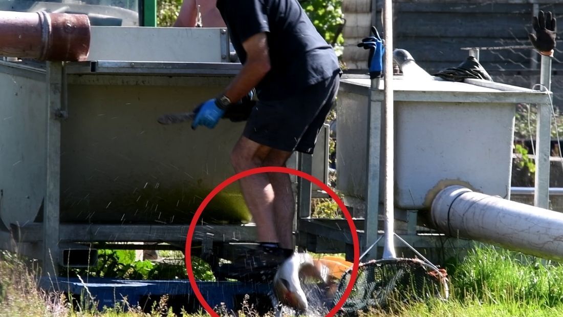 Surveillance footage also captured workers handling the fish at a grading station, where they’re sorted by size for slaughter. Workers were seen throwing live trout, kicking them with frustration as they slapped on the ground and bashing them around the head with a wooden priest – an extremely ineffective killing method, prolonging a painful death. One fish was observed writhing around for several minutes while the worker failed to catch and kill them with the end of a short broom handle.
